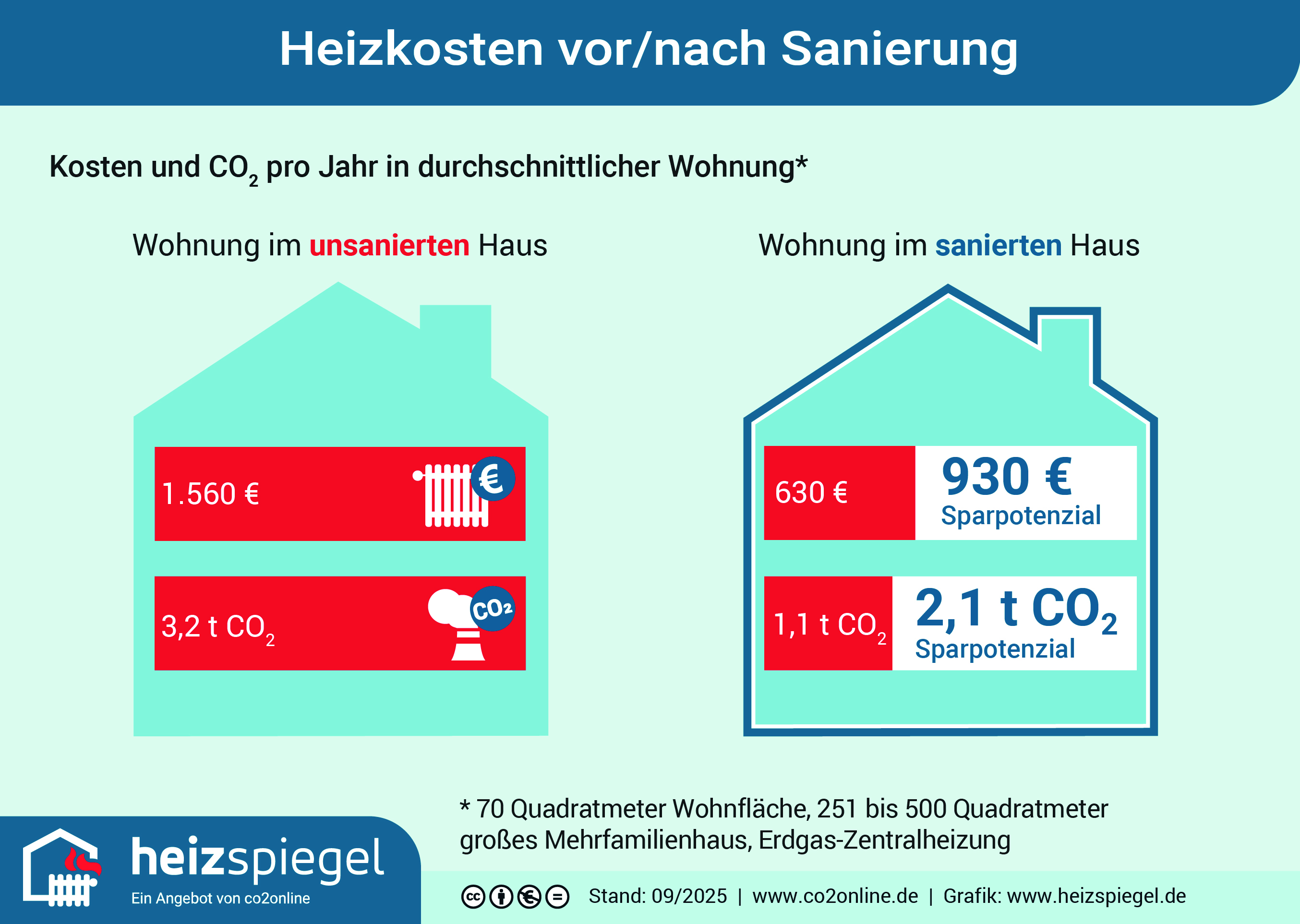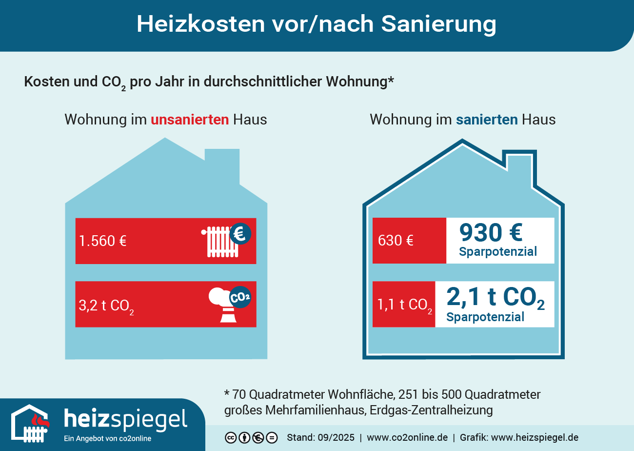 Auch die CO2-Emissionen sind in sanierten Gebäuden deutlich geringer. In einem energetisch sanierten Mehrfamilienhaus mit Erdgas-Zentralheizung entstehen in einer 70-Quadratmeter-Wohnung pro Jahr etwa 1,5 Tonnen klimaschädliches CO2 durchs Heizen. In einem energetisch schlechteren Gebäude sind es im Schnitt 3,8 Tonnen. Um diesen CO2-Unterschied zu kompensieren, müssten rund 200 Bäume zusätzlich gepflanzt werden.
